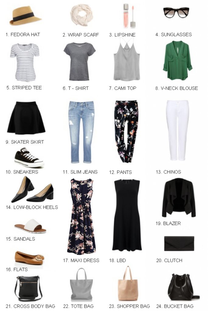 Pants & Dresses: 9. Skater Skirt | 11. Slim Jeans | 12. Floral Print Pants | 13. Chino Pant | 17. Maxi Dress | 18. Little Black Dress |